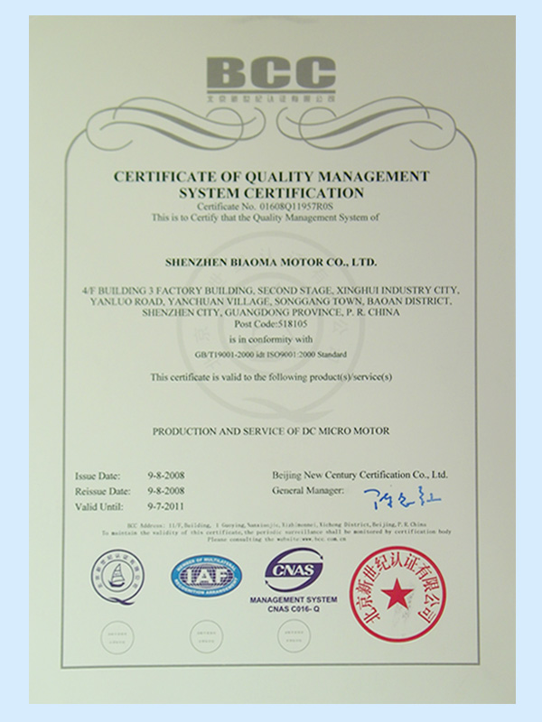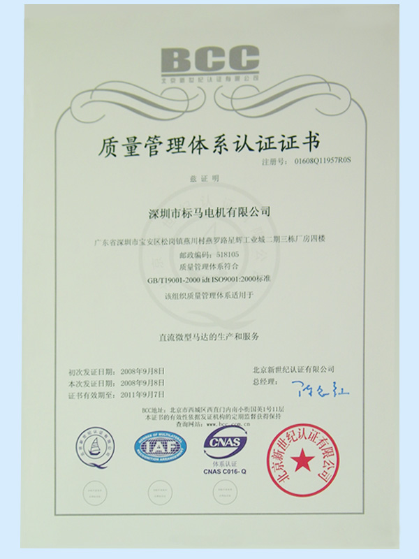 深圳市标马电机有限公司坚持质量第一、信誉第一,为不断向顾客提供优质产品,达到顾客满意,公司按ISO9000系列标准的要求建立质量管理体系,并且取得了ISO9001:2000质量管理体系认证合格证书